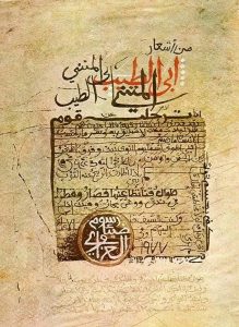ويركز الفنان في هذه العبارة على أبي الطيب المتنبي وذلك بإعادة اسمه مرتين وكتابته باللون الأحمر مرة واحدة لإبراز قيمة هذا الشاعر دلاليا والمحافظة على التوازن بصريا ، وتحت هذه العبارة نجد شكلا يشبه ورقة متآكلة ومحاطة بكتابات من كل اطرافها، كما آن داخلها يحتوي على عدة أبيات شعرية وبدأها الفنان بكتابة البيت الشعري التالي