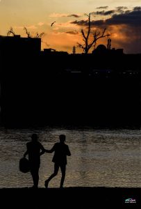 تُجمد اللوحة لحظة ساحرة من الغروب، حيث تتوهج السماء بألوان دافئة تتراوح بين البرتقالي العميق والأصفر الذهبي، تتخللها سحب متفرقة تُضفي عمقاً إضافياً. في المقدمة، يظهر ظلان لشخصين يسيران على ضفة مائية هادئة، يبدو أحدهما يحمل شيئاً ما، وتوحي هيئتهما بالرفقة أو الصداقة. يتشكل أفق المدينة في الخلفية ككتلة داكنة، تبرز منها قباب المساجد ومآذنها، بالإضافة إلى أشجار جرداء تزيد من عمق المشهد. يضاف إلى ذلك طائر وحيد يحلق في السماء، يكسر سكون اللحظة ويمنح المشهد إحساساً بالحرية والامتداد. هذا التكوين يُبرز التناغم بين العناصر الطبيعية والبشرية والحضرية في إطار بصري واحد.