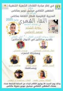 مكناس، المغرب – عاشت مدينة مكناس، مساء السبت الموافق 26 يوليو 2025، أمسية ثقافية وفنية استثنائية، وذلك باحتضان المقهى الثقافي ميشيل جويبر لحمرية فعاليات النسخة السابعة من “اللقاء الشعري” الشهري. وقد جاء هذا اللقاء، الذي نظم بشراكة مثمرة مع المديرية الإقليمية لقطاع الثقافة بمكناس، تكريماً خاصاً للقامة الشعرية البارزة، الشاعر محمد الإمامي.