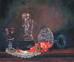 إن كل ما على المائدة من مفرش الأطباق المزركش المنقوش، ونوع الآنية الزجاجية، ومحتواها من الأطعمة: الفاكهة في صورتها الأصلية، والعصير في القارورة، يدل على نهاية حفلة طعام صاخبة، وإن كان عدد أفرادها، لا يتجاوز الاثنين، فان فراغ كأس ووضعه المنكفئ على الطاولة، ونصف امتلاء الكأس الثاني، وحفاظه على وقفته، ونصف امتلاء القارورة، وتناثر حبات الفاكهة إلى جانب العنقود، كل ذلك يدل على صولة طعامية انتهت بهذه النهاية، ولا نملك تفاصيلها، بل نستشفها من نهايتها المعروضة علينا. وربما دللتنا اللوحة على فلسفة النهايات وأهميتها. وقد لا تكون نهاية واحدة على الرغم من أن المشاركين واحد ومشترك، والتفاصيل كانت مشتركة وواحدة كذلك.