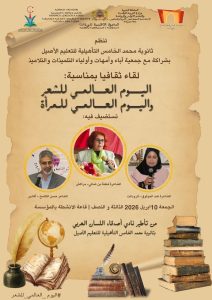 في أجواء مفعمة بعبق الحروف وسحر القوافي، وبمناسبة الاحتفاء المزدوج باليوم العالمي للشعر واليوم العالمي للمرأة، شهدت رحاب ثانوية محمد الخامس التأهيلية للتعليم الأصيل بتارودانت، يوم الجمعة 10 أبريل 2026، لقاءً ثقافياً وازناً نُظم بشراكة بين إدارة المؤسسة وجمعية أمهات وآباء وأولياء التلاميذ، وتحت إشراف وتأطير نادي “أصدقاء اللسان العربي“.